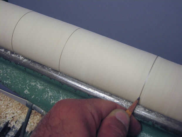 yo ahora marca hacia fuera el palo poniendo lápiz líneas cada 3" en el espacio en blanco, incluyendo el extremo de la empuñadura y el cañón. Solo sostenga un lápiz hasta el hilado blanco y dejará una línea clara.