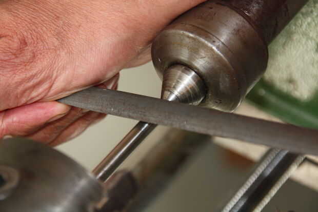 En este punto puede formar la punta de su lápiz. Usé el mismo ángulo como la punta del relleno. Puede utilizar un archivo para esto si usted no puede hacer esto en su torno.