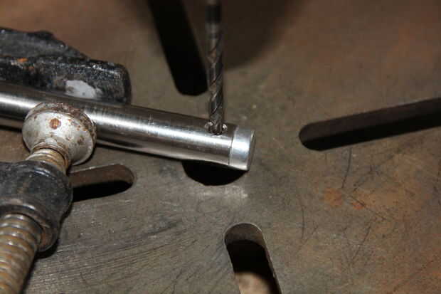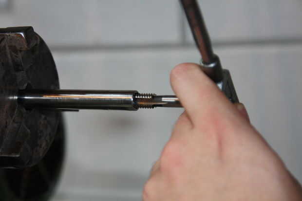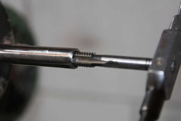 Me pareció el más fácil de utilizar el torno para este paso también pero no es necesario. Primero necesita grifo rosca M10 dentro de los tubos de acero inoxidable, 10 mm de rosca debe ser suficiente. Este es el momento de bajar el diámetro de la tubería. He utilizado un diámetro de 12 mm, esto te deja con 1mm de espesor de pared. Ahora puede arena y polaco para arriba y la parte o de sierra 85 mm.