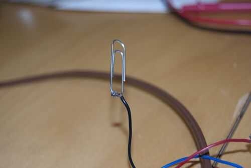Ahora toma un lado del cable y conectarlo a un clip de papel - sólo la puede tira y envolver el alambre alrededor de la pinza, pero usted puede soldarlo Asegúrese de que permanece encendido.