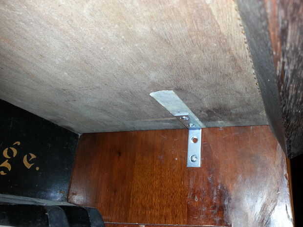Con la cubierta de teclado enroscada que se extiende horizontalmente, los soportes previamente instalados en L ahora cuelgan hacia abajo como estalactitas.  Uno de "brazos" cada L-brackets eran paralelas longitudinalmente a la cubierta del teclado, en la parte inferior de la cubierta (el "techo" sobre las teclas).  Los brazos, sin ningún tornillo, fueron paralelos en a las paredes izquierdas y derecha en los extremos derecho e izquierdos del teclado.  Atornillando tornillos de cabeza Philips a través de los agujeros en los brazos de soporte paralelo a las paredes, el bar de la cubierta de teclado ya no simplemente colgaba hacia fuera en espacio, pero tenía apoyos y así podría apoyar una cantidad razonable de peso.