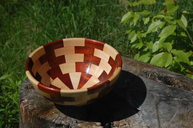 Este es mi instructable para dar vuelta a un recipiente de madera dividido en segmentos. He hecho éste con madera rescatada de viejos proyectos y muebles. Usa cerezo y arce para el contraste, pero puede usar casi cualquier madera. He encontrado que ayuda a recogerlos de dureza similar. Al lijar, uno no desgastar más rápido que el otro. Yo será la construcción del tazón de fuente blanco de segmentos de cerezo y arce pegados juntos. Esto proporciona dos beneficios sobre convirtiendo un recipiente de un sólido espacio en blanco. En primer lugar, hay menos residuos porque el espacio en blanco ya será hueco y aproximadamente las dimensiones de la taza final. En segundo lugar, al girar, casi siempre estás cortando con el grano de la madera, en lugar de a través de él. (La excepción es el disco en la parte inferior) Esto reduce el lagrimeo, desgaste en las herramientas y hace montones de esas cintas de afeitar que son tan satisfactorias ver fuente de la pieza de trabajo y llenan para arriba en el piso.