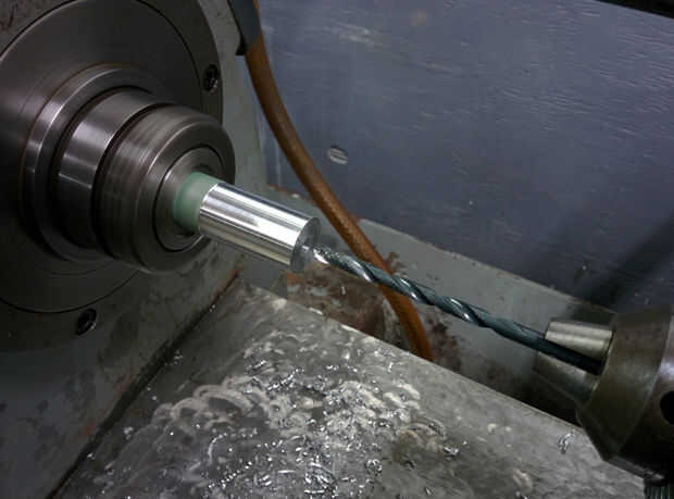 Chuck la broca #7 y perfore a una profundidad de 3/4 de pulgada. Añadir algún lubricante a la punta ayudará con virutas.