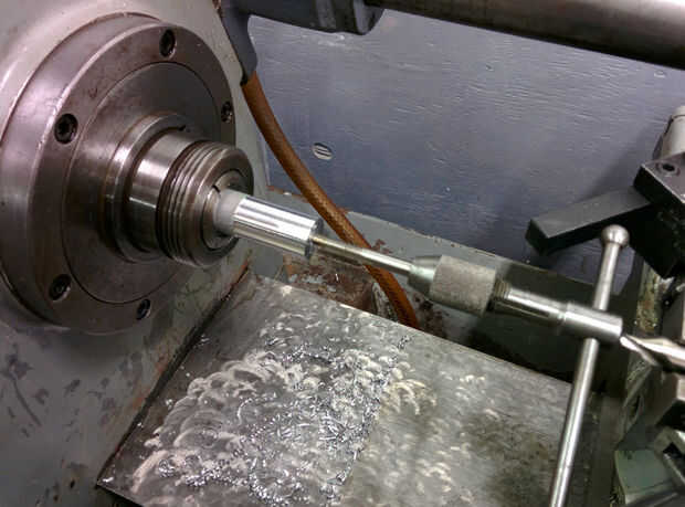 Tirada del grifo de 1/4-20 en el mango del grifo y añadir un poco lubricante a las roscas del grifo para evitar que se pegue. Utilice un centro en el contrapunto para alinear la parte posterior de la manija del grifo con el orificio taladrado (yo usé un taladro de centro). El taladro por grifo hasta.