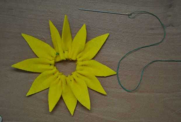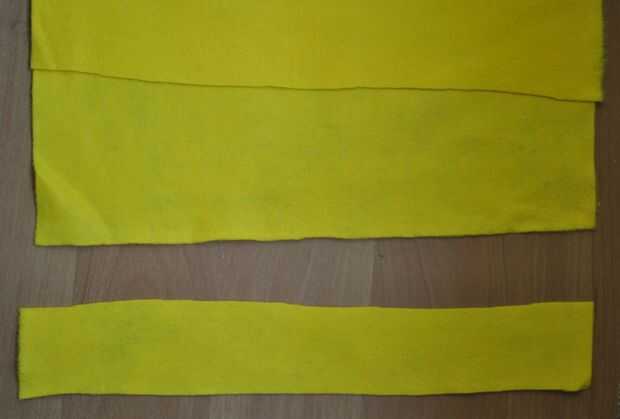 1. en primer lugar tenemos que cortar un trozo de fieltro largo amarillo. 2. Luego tenemos que dividirla en 15 pedazos. 3. a continuación tenemos que cambiar cada pedazos de turba 4. cadena de turbas todos en un hilo.
