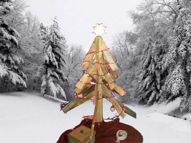 este árbol de Navidad de madera caseros fue iniciado por un edificio de una madera de base y apoyo de 1 1/2" por 5' cilíndrica poste de madera, luego cada 2 x 4 se ha reducido a varias longitudes. Un agujero se corta al final de cada pieza se deslice