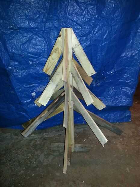 este árbol de Navidad de madera caseros fue iniciado por un edificio de una madera de base y apoyo de 1 1/2" por 5' cilíndrica poste de madera, luego cada 2 x 4 se ha reducido a varias longitudes. Un agujero se corta al final de cada pieza se deslice