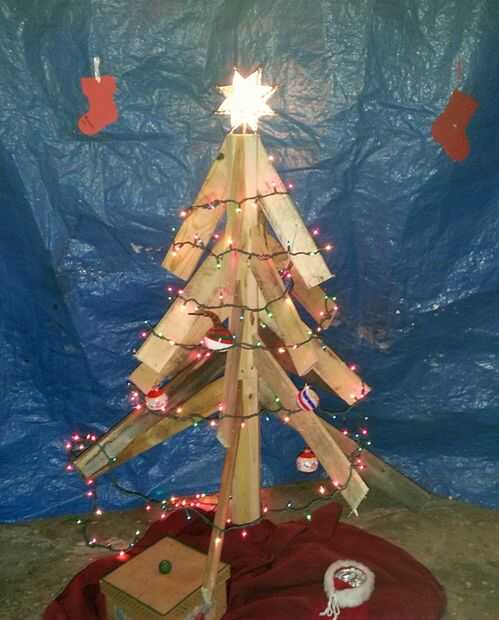 este árbol de Navidad de madera caseros fue iniciado por un edificio de una madera de base y apoyo de 1 1/2" por 5' cilíndrica poste de madera, luego cada 2 x 4 se ha reducido a varias longitudes. Un agujero se corta al final de cada pieza se deslice
