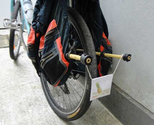 Observe las mochilas de los palillos de bambú impide intervenir con las ruedas. Ahora, depende de tu gusto (pies tamaño, mochila etc.) correa de bambú se pega con la rejilla con las pinzas (antes de simular el peso de la mochila cargada tirando de él hacia abajo y allí la correa).