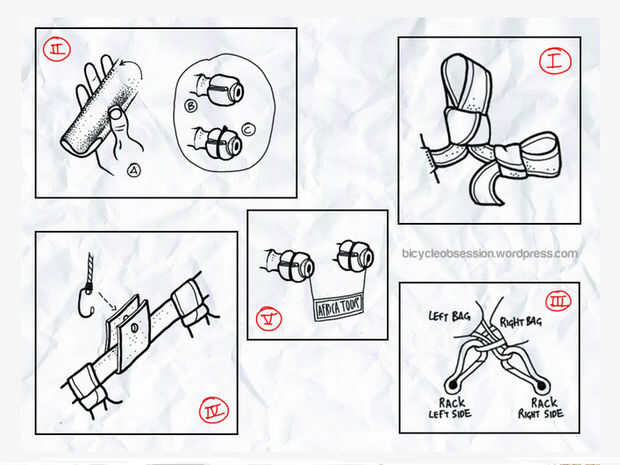 Ok, aquí es la idea principal. Usted necesita solamente las correas de naylon que se encuentran en la parte inferior de la mochila y conectan a los arneses de hombro (si sus mochilas se utilizará sólo como alforjas parrilla que usted puede cortar las correas de hombro).