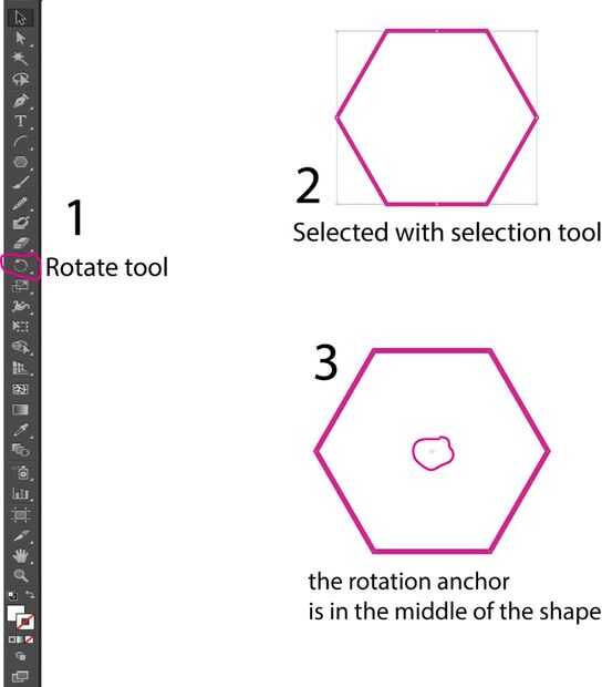 Utilice la herramienta Selección y seleccione la forma, luego presione la herramienta Rotar en la barra de herramientas. Verás un ancla color azul claro en medio de la forma.