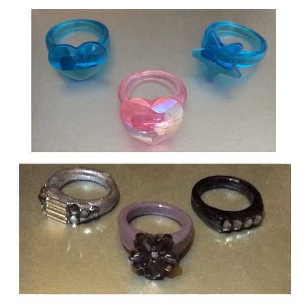 la imagen superior muestra tres de los anillos de plástico baratos se puede encontrar en la tienda del dólar, en un arcade, o en los dedos de una niña de seis años. La foto inferior parece ser (casi) joyería que se podría comprar en Nordstroms! Como se puede adivinar por el título, los anillos de la parte inferior se hacen de plástico unos en la parte superior, y aquí le mostrará cómo lo hice.