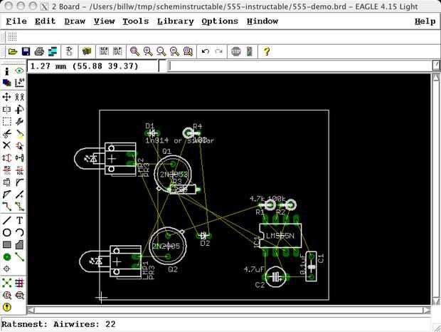En este caso, puse el transistotrs de salida de energía cerca de lámparas que están asociados con, y miré en la web para un diseño del 555 que funcionara bien (durante más tiempo, intenté hacer placas con la tapa de distribución cerca de las resistencias de temporización, y siempre necesitaba un puente. Suspiro.) («Que del nadie trabajo evadir sus ojos».)