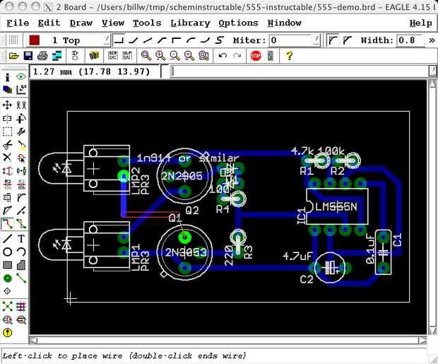 Hay un par de maneras que podríamos ruta esta señal manualmente, incluyendo algunas rutas snakey entre pines del transistor que no debido a las reglas de diseño que especifica el Autoruter. Se trata de un rastro corriente relativamente alto, y decidí que no manualmente violo las normas de diseño cualquiera. En cambio, usaré un puente de alambre en el lado del componente, que puedo modelo de águila como un rastro del lado superior.