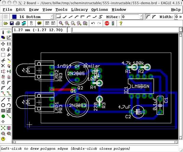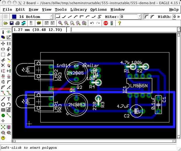 En águila. tales áreas de señal grande se dibujan con el comando "polígono". Hay un icono en la barra de herramientas de dibujo de polígonos, pero crea polígonos asociados a una nueva señal, y me parece que cuando se crea un polígono para una señal existente, es más fácil escribir la forma del texto del comando en el área de comandos de texto. Para crear un polígono conectado a una señal de 'tierra' el nombre, escriba "poly gnd" dándole un nombre de señal en el comando, el polígono voluntad automatcailly conectar a esa señal. (Si se dibuja un polígono con el icono, usted puede conectarlo a una señal más adelante mediante el comando "name" para cambiar el nombre del polígono. (sin embargo, después de esto, no puede renombrar el polígono nuevo sin cambiar el nombre la señal así.))