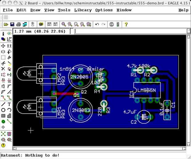 Ahora repetimos el proceso para el voltaje positivo. Sin embargo, nunca llamamos a esa señal cuando dibujó el esquema, así que tendrá un nombre al azar como «N$ 23»; Podemos utilizar el comando "INFO" para encontrar el nombre de señal cuando dibujamos el polígono, después de lo cual es lo mismo que dibujar el polígono GND.