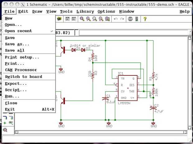Así que este es el esquema que tenemos del instructivo esquemático. Arriba en el menú Archivo, es una selección "Cambia al tablero". Si lo hacemos desde un esquema desnudo, se ofrecen crear la Junta desde el esquema para nosotros (decir "sí") y luego nos dejan sentado en el Consejo Editor.