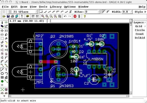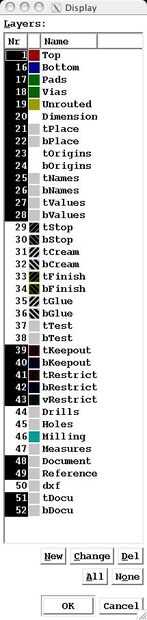 Editor de la mesa directiva de águila tiene muchas más capas que el editor de esquemático. Una confusa multitud de capas. La mayoría de los comandos de dibujos tiene un menú desplegable de selección de la capa que se puede utilizar para especificar que desea dibujar la capa (las excepciones incluyen objetos como vías que abarcan varias capas).