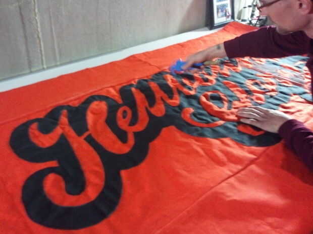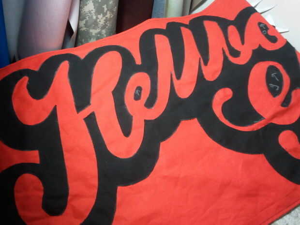 Este proyecto comenzó con la idea de crear un nuevo conjunto de indicadores para la banda para ser utilizado como telón de fondo de escenario. El logo de Hellbound Gloria debían ser cosidos sobre tela naranja brillante, para ayudar a saltar fuera del negro en el ajuste de la etapa. Poner algunas pancartas cutres de vinilo sentía sin alma y queríamos tener una configuración adecuada, para ser vistos por los cientos de miles de fans en esta gira.