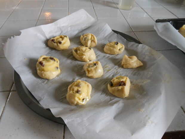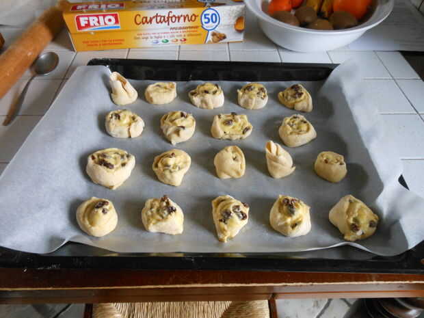 Alinee tortas separadas así obtenidas en la placa para horno, pincelar con clara de huevo batida y deje reposar durante 1 hora o menos (una vez más no tiene que esperar todo este tiempo, cuando parecen suficientemente fermentado está lista para ser disparada). Hornear a 180 ° c hasta que estén bien dorados.