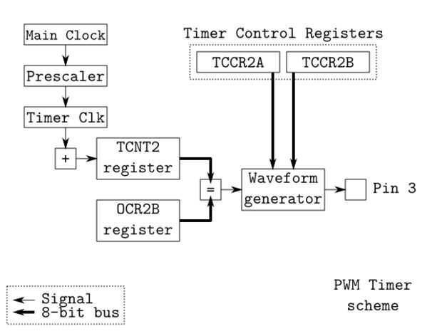 En el ATMega328P hay tres temporizadores que pueden utilizar para generar señales PWM, cada una de ellas tiene características diferentes que puede utilizar. Para cada temporizador corresponden dos registros llamados A comparar registros de salida / B (OCRnx) que se utilizan para definir el ciclo de trabajo de la señal.