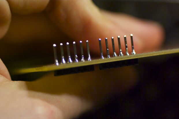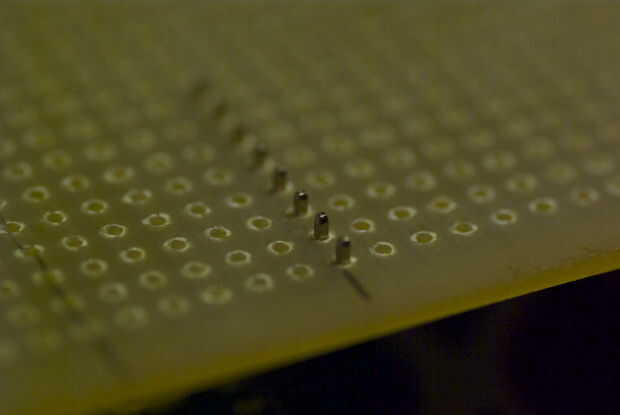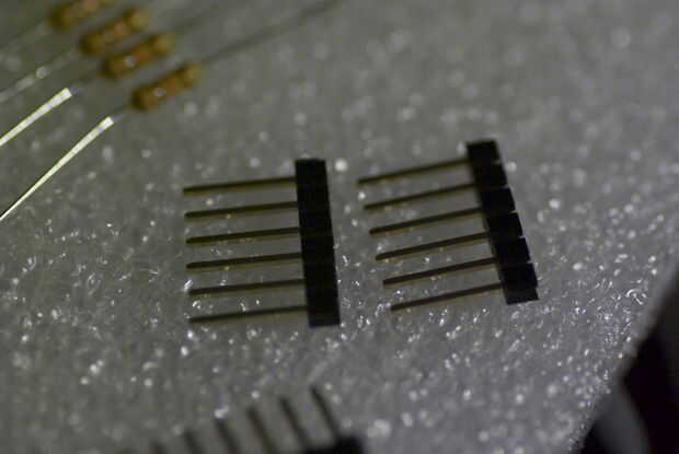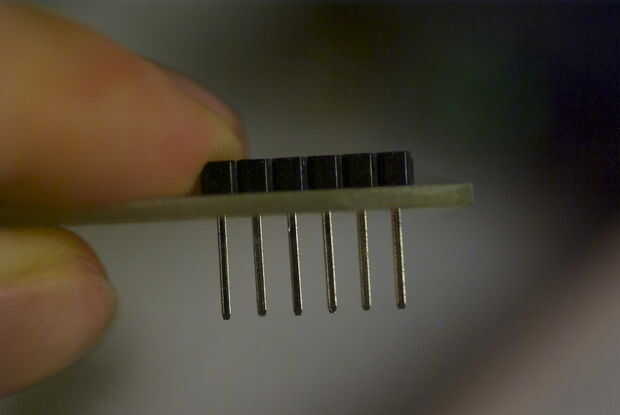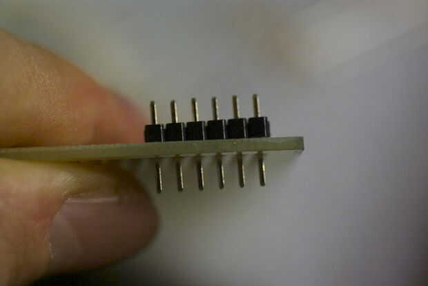 Insertar la tira de pines en la placa, como en la imagen, podemos empujar las clavijas, que sólo en un lado del plástico negro. Entonces podemos soldarlos en el mismo lado donde se insertará en el Arduino.
