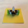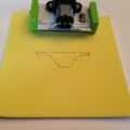 Con el eje del motor hacia arriba, verás que la placa de circuito y el motor sobresalen hacia abajo un poco por lo que es un poco inestable. Para crear una plataforma estabilizadora del motor, vamos a usar la espuma del arte. Primero, coloque el motor hacia abajo y en el centro de una pieza de espuma. Con un trazado de lápiz alrededor de los bordes de la placa, donde presiona en la espuma, así como los cables del motor y carcasa del motor como se muestra en la imagen. Con el cuchillo, corte la forma de tablero de motor de alambre. Esto debe crear un espacio en el que el tablero de motor está ubicado para mantener el eje apuntando hacia arriba. Usando esto como una plantilla, cortar la misma forma de la segunda pieza de espuma. Retire el adhesivo y pegue estos uno encima del otro y luego a la mesa de cereales para más estabilidad.