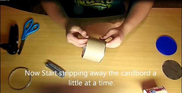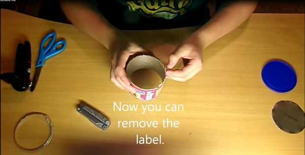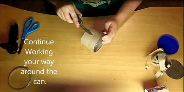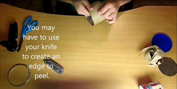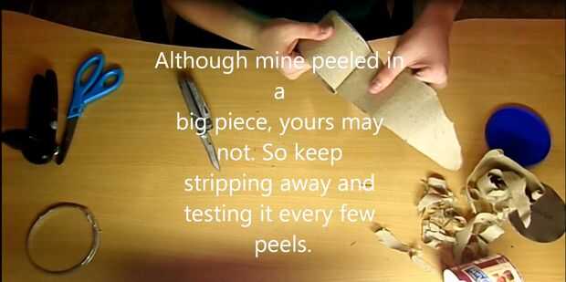 Ahora que tienes la parte inferior y el anillo inferior de la lata cortados, es hora de empezar a remover el cartón. Primero es necesario quitar la etiqueta. Entonces donde se corta el anillo de la parte inferior, debe ser un poco "maltratado". Esto es donde puede empezar a pelar en. Seguir su forma de trabajo alrededor de la lata como se muestra. Puede ser necesario utilizar su cuchillo para crear un borde a la cáscara. En la lata usé, pelado una paz grande de cartón una vez que había pelado una cierta cantidad. Tuyo no puede hacer esto no estoy seguro, pero recuerde no recorrer todo el camino en el vierteaguas dentro de la lata.