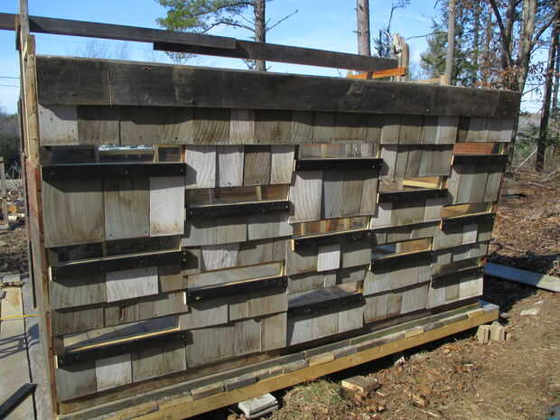 Las tejas antiguas son de la casa como ha sido vivido. Cedro de buena calidad, con una terrible pintura color en ellos, por lo que solo les voltea sobre (más fácil de pintar, también, como al revés tiene una superficie plana). "" Hacia fuera con adornos reciclado fleje de un experimento de hidroponía y había rematado todo con un pesado trozo de roble.