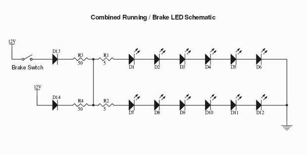 Aquí está un hipotético circuito utilizar los LEDs agregados como combinados de corriente y las luces de freno. No he probado esto, pero debería funcionar. Para este circuito, con el freno de apagar, la corriente directa del LED será unos 18 mA y cuando chocas los frenos, el actual delantero del LED se elevará a unos 33 mA dando por resultado una salida de LED más brillante. Los valores de resistencia final utilizados pueden necesitar ser ajustado para obtener un buen compromiso de razonable luz brillo y luminosidad adecuada modulación cuando se aplican los frenos.