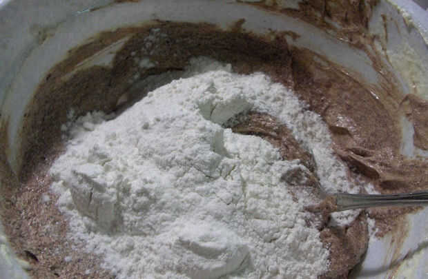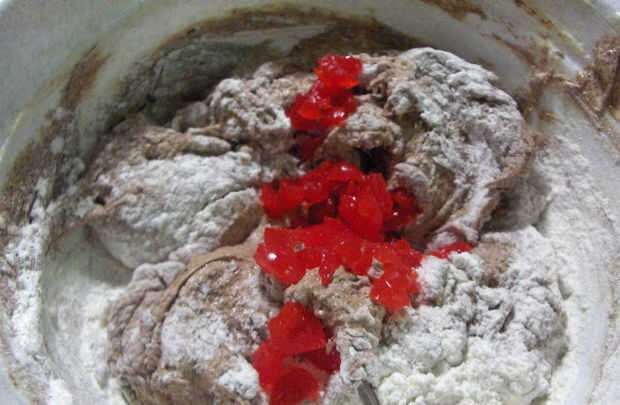 Agregue harina y cerezas glace picado/rodajas hasta que estén bien mezclados