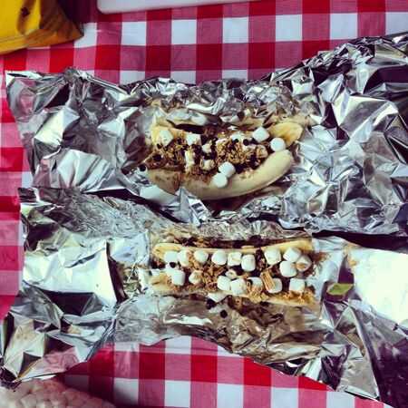 Barcos de plátano se dividen plátano con mini malvaviscos, chips de choc y Golden Grahams u otros crujiente - envuelto en papel de aluminio y echada sobre la parrilla hasta pegajosa. Desenvuelva y comer con cuchara.