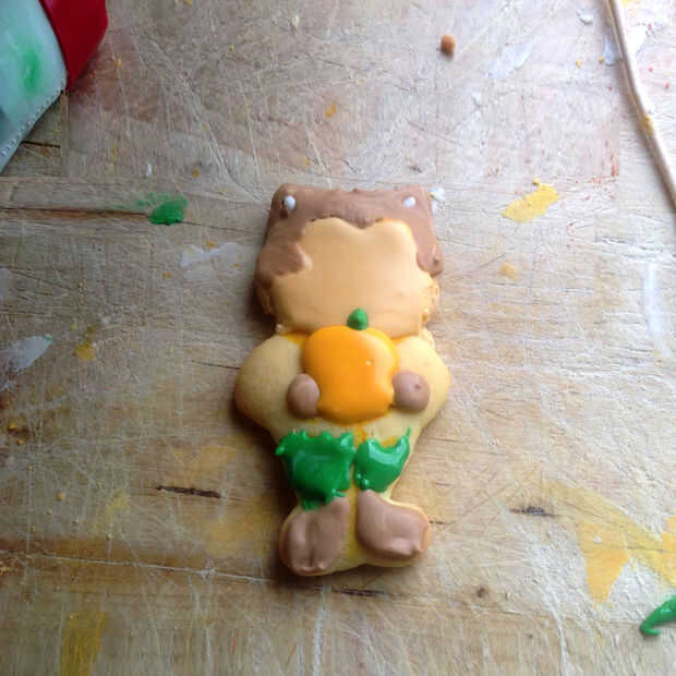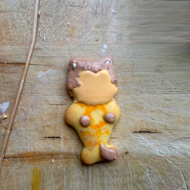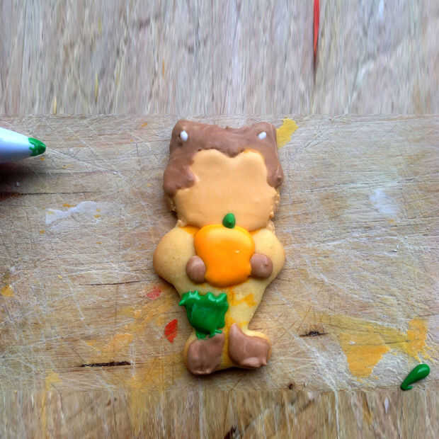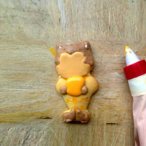Cuando la cara y los oídos internos estén secos, pipa en el marrón utilizando el mismo método de contorno y de inundación. Entonces puede hacer las manos y uno de los pies.