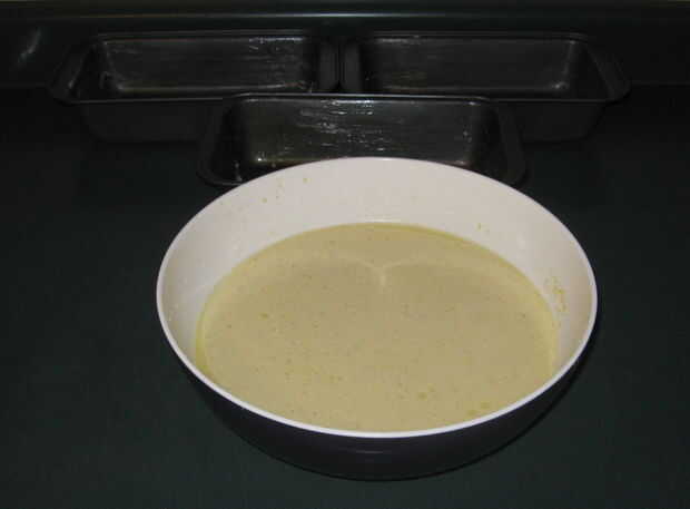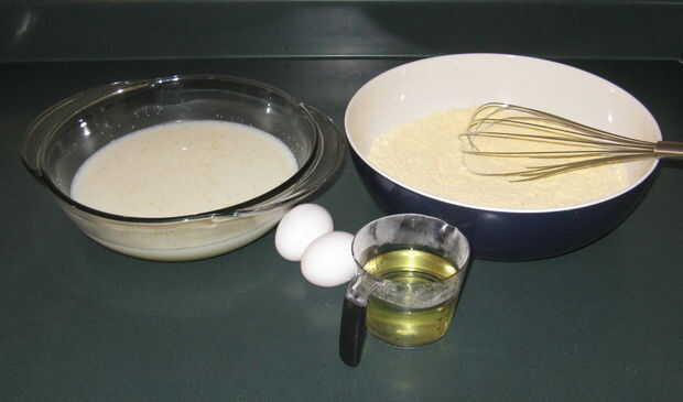 Mezcla en la mezcla de harina de maíz con la harina, huevos y aceite y batir hasta que quede suave.