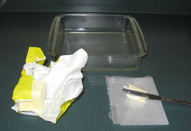 Un 8 x 8 x 2 pulgadas para hornear pan o bandejas de pan si desea menor pan con grasa. Me gusta usar mantequilla engrasar mis sartenes poniendo la mantequilla en papel de cera y extenderla sobre la bandeja.