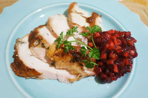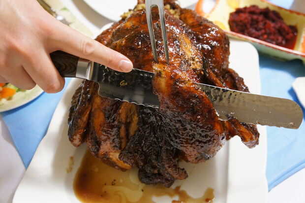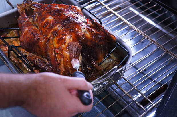 Acción de gracias es nuestro favorito de vacaciones y este año fuimos bendecidos al tener mi hijo y mi nuera aquí para esta época especial del año. Es realmente un chef amateur, un foodie casa y considera que las aves de corral a una de sus especialidades. Este año nuestro pájaro era una mezcla única entre su probado y verdadero pájaro de acción de gracias con mi esmalte Granada-mantequilla.