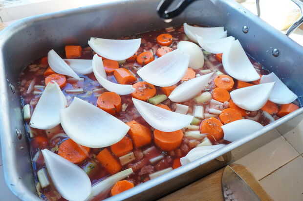 Vierta el caldo de pavo en la asadera y agregar las zanahorias, apio y cebolla.