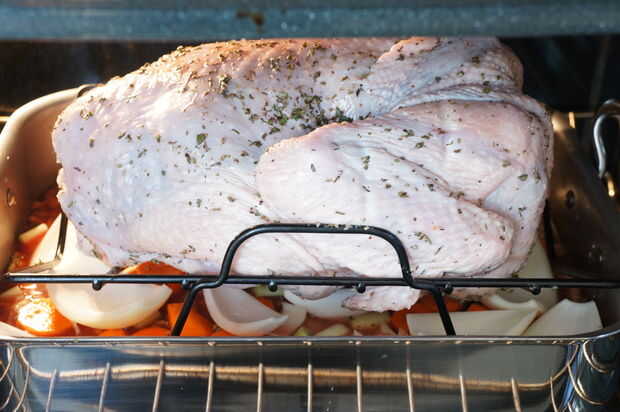 Coloque el lado del pecho de Turquía hacia abajo en la asadera. Este método aumentará la humedad en la carne blanca como la grasa de la carne oscura representa y drena hacia abajo.