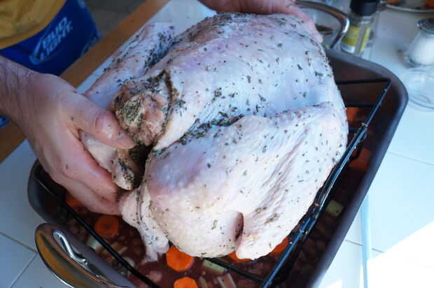 A medio camino a través del proceso de cocción (aproximadamente 1.5 a 2 horas para un ave de 15 libras) usted Levante el lado de mama Ave. El tiempo de cocción completo dependerá de su tamaño de aves. Nuestros 15 libras completamente rellenos aves tuvo unos 3.75 horas cocinar completamente.