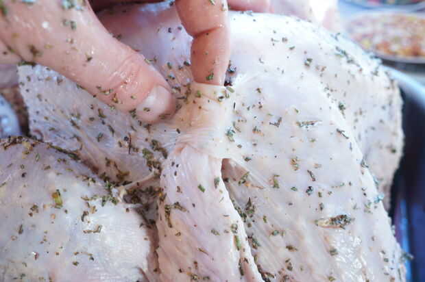 Tomando nota de que la punta del ala es hacer una pequeña incisión de una pulgada y media más bajo que el ala punta cuidando sólo separar la piel de la carne creando un pequeño bolsillo para que descanse en la punta de ala.