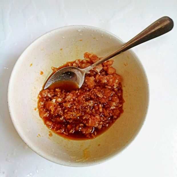 Revolver la mezcla en una sola dirección y por lo menos 3 minutos hasta que la carne de cerdo se vuelve pegajosa.