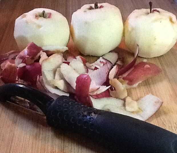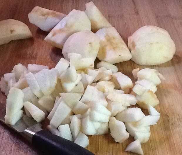 Pelar, núcleo y picar la manzana. Cuántos necesita depende de su preferencia y el tamaño de sus manzanas. Mis manzanas estaban en el lado pequeño, usé 3.