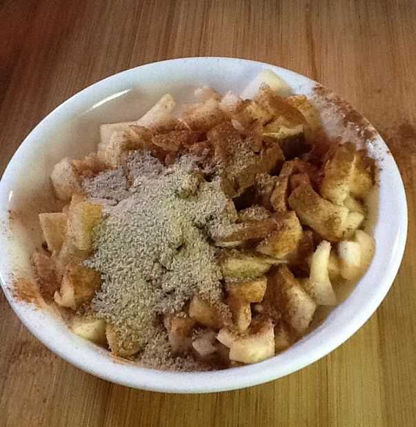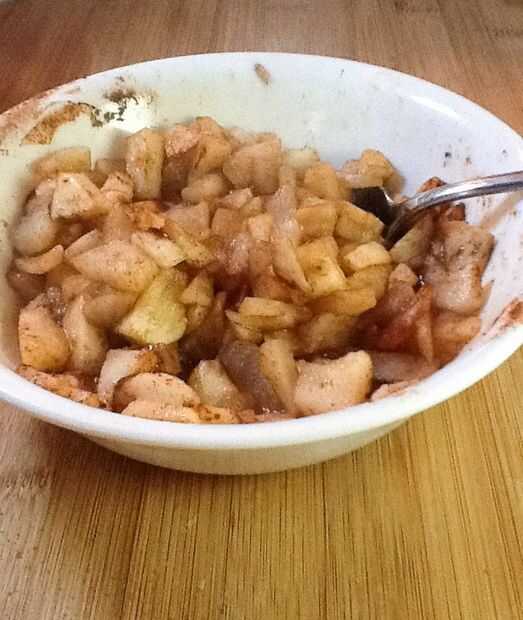 Si lo desea, agregar una cucharada de azúcar morena y algunos canela y cocinar ligeramente las manzanas. Cociné minas en el microondas durante 2 minutos, les revolviendo cada 30 segundos. Puede también simplemente dejarlos crudos y dejarlos cocer en el horno, que le dará un poco más firme, más los trozos de tarta de manzana.