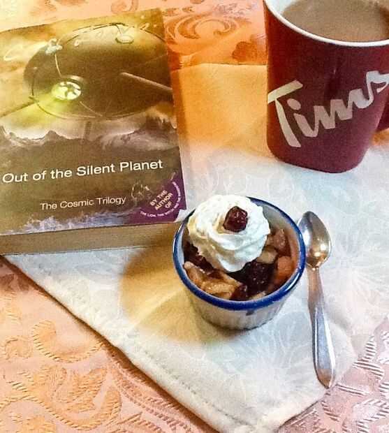 Siéntase como postre un poco de algunos de los restos manzanas y arándanos, preparar una taza de té y sentarse con un buen libro (fuera del planeta silencioso por C.S. Lewis es un muy buen libro).