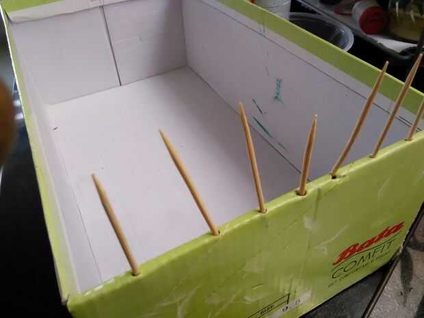 Pequeños agujeros a lo largo de la anchura de la caja de zapato con una varilla metálica puntiaguda e inserte los picks de diente en estos agujeros.