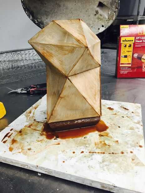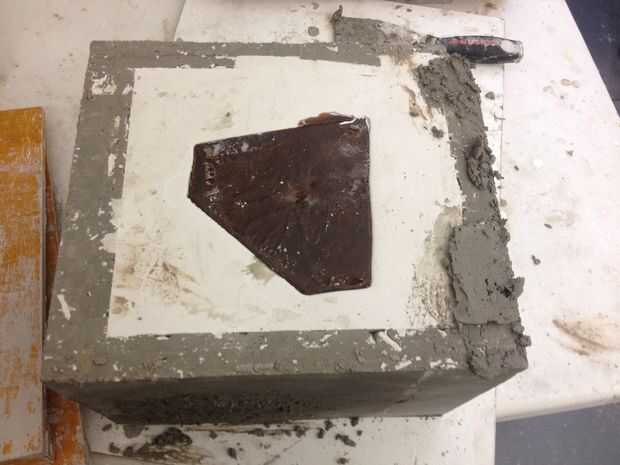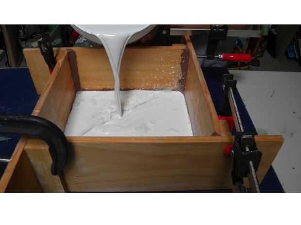 Fijar la puerta (spru) de la forma a la mesa. Construir una caja alrededor de su forma con coddles y abrazaderas. Deje al menos 1" alrededor de su forma. Utilizando arcilla suave, selle todos los lugares de yeso podría escaparse fuera de la caja. Se realizará su molde de yeso de sílice con un chaleco refractario. Usando la relación de 1 lb de agua a 1.5 libras de yeso/sílice, mezcle suficiente yeso para rellenar el molde (siempre añadiendo mezcla seca al agua). Utilizar silicona de moldeo chapista y "silcosil". Una vez que el molde está configurado, reconstruir el coddles para dejar otro 1" alrededor del perímetro y verter material refractario como Mizzou o KS-4 como una capa de la chaqueta (para fuerza). Deje el molde establecido y luego voltee. Vapor a la cera.