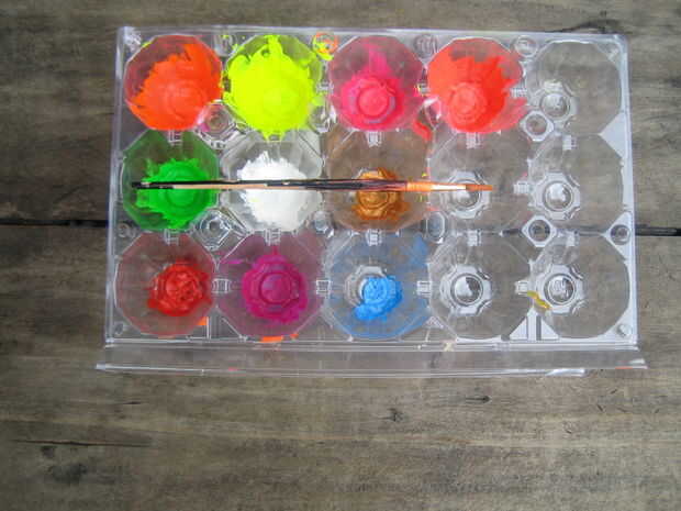 . Ahora estás listo para pintar. Si no tiene ninguna pintura de vidrio especial o como yo quiere mezclar sus propios colores, utilice un soporte de vidrio o porcelana, (otra vez utilicé pebeo,) y mezclar pintura acrílica en una proporción de alrededor de 50/50.
