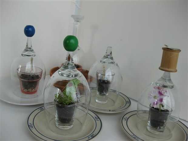 Tenga en cuenta que un terrario cerrado es diferente de lo que la mayoría llaman un terrario. Un terrario cerrado debe ser su propio ecosistema. La humedad liberada debe reciclar nuevamente dentro de la planta/la flor. Se pueden utilizar cualquier planta o flores. Es importante mantener el suelo de la parte inferior de la olla, o en este caso el vaso de chupito. Por esta razón pongo los granos, el carbón de leña y suelo con fibras. Musgo se utiliza a veces entre el carbón vegetal y el suelo.