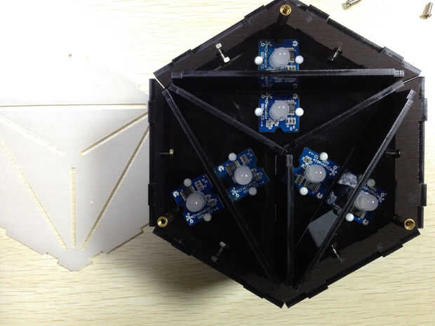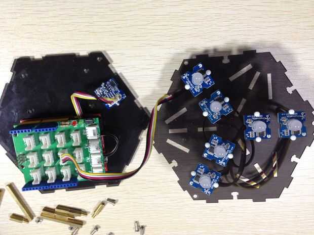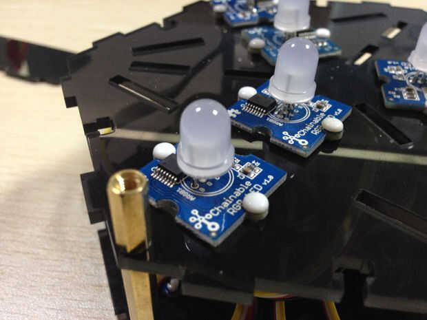 La capa superior se sientan arboleda 6 - Bra RGB LED. Están separados por bloques de acrílico para evitar la interferencia de la luz.