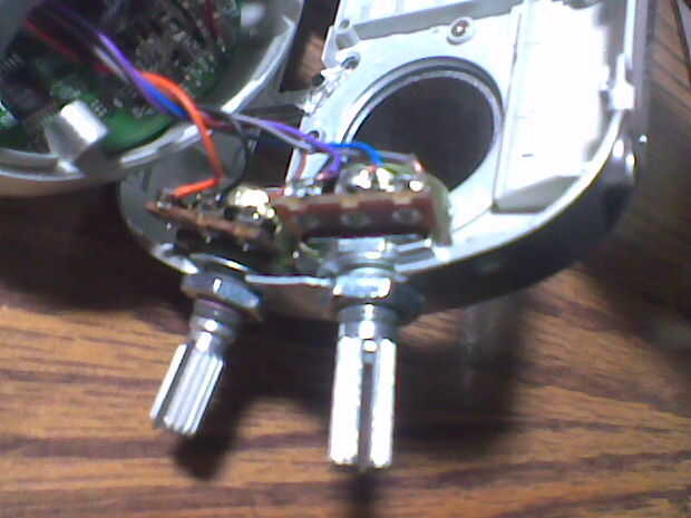 Conectores de los potenciómetros en el lado izquierdo de la cámara, frente a la pantalla LCD. Este es el mejor lugar para ponerlos porque tienen suficiente espacio. En el cuadro no. 2, las "patas" de las perillas corté lo más posible, como chocar el PCB o placa de circuito impreso, pero tenga cuidado de no dejar ir. Sólo tienes que minimizar el espacio. Soldar los cables a los sindicatos como el efecto que desee y hace que la placa con cinta para evitar encontrarse con el PCB. Si tu cámara al girar la pantalla se congela o blanco produce un apagado repentino, significa que están tocando un alfiler o alambre potenciómetros. Aislamientos tanto como sea posibles de los potenciómetros de.